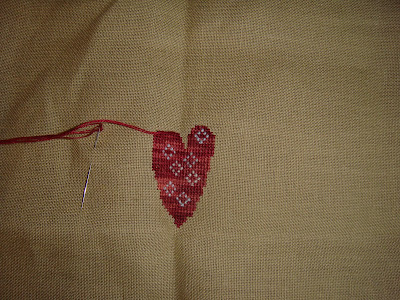 This is my heart for the RR...it's stitched in Sampler threads........MISCOUNTED...yep...I have to frog the WHOLE THING...needless to say, it's stitched over 2 on 40 count....40 COUNT....it stinks! I think I need new glasses